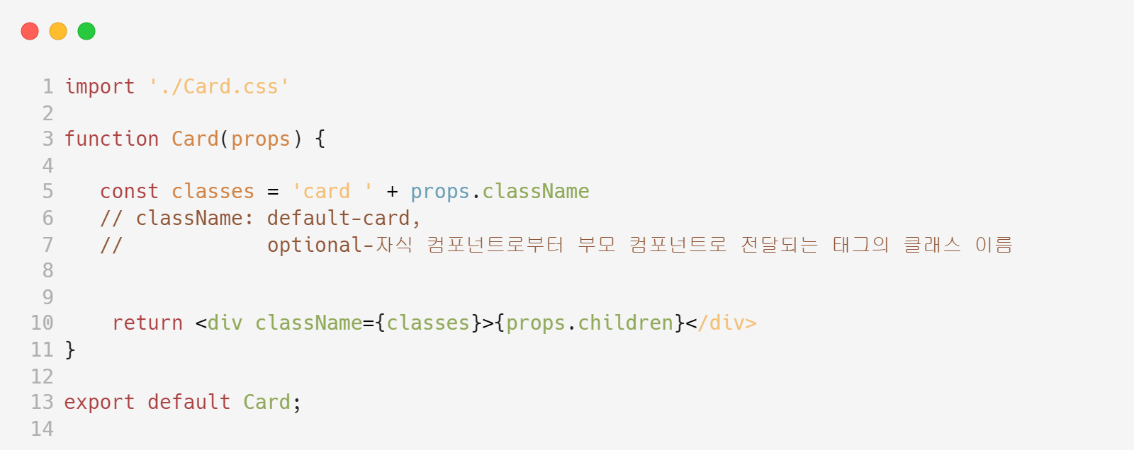 3. Card Component의 return에서 <div></div> 사이에 contents가 없으므로 props를 활용하여 내용 추가