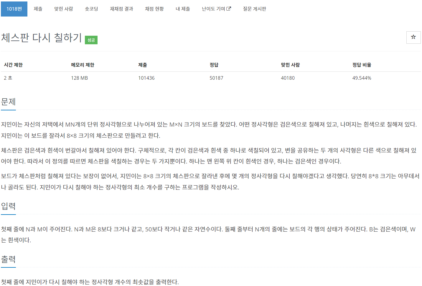 | [BaekJoon] 1018번 체스판 다시 칠하기 문제풀이 (Success) (0) | 2023.08.14 |