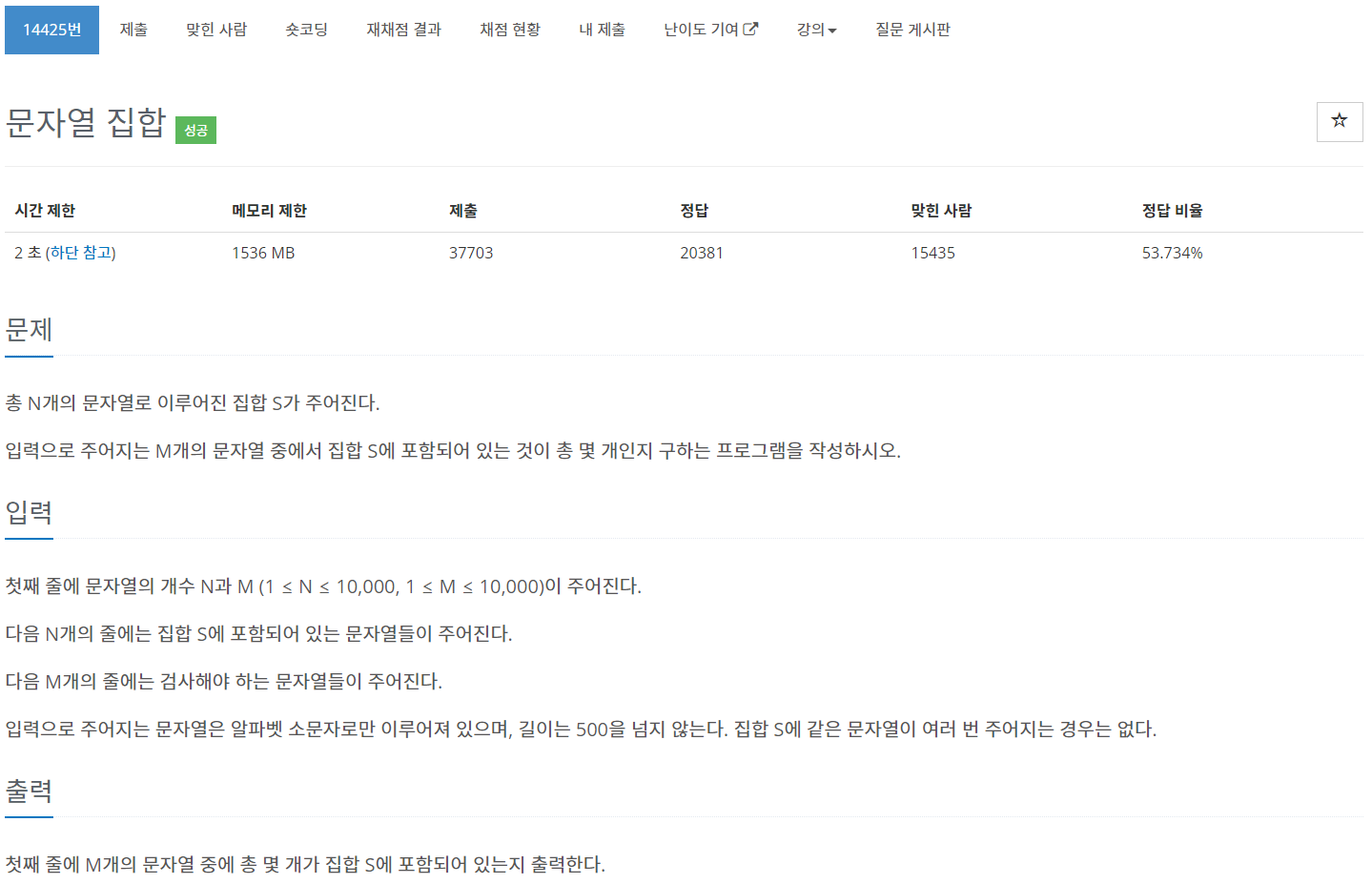https://www.acmicpc.net/problem/14425 14425번: 문자열 집합 첫째 줄에 문자열의 개수 N과 M (1 ≤ N ≤ 10,000, 1 ≤ M ≤ 10,000)이 주어진다. 다음 N개의 줄에는 집합 S에 포함되어 있는 문자열들이 주어진다. 다