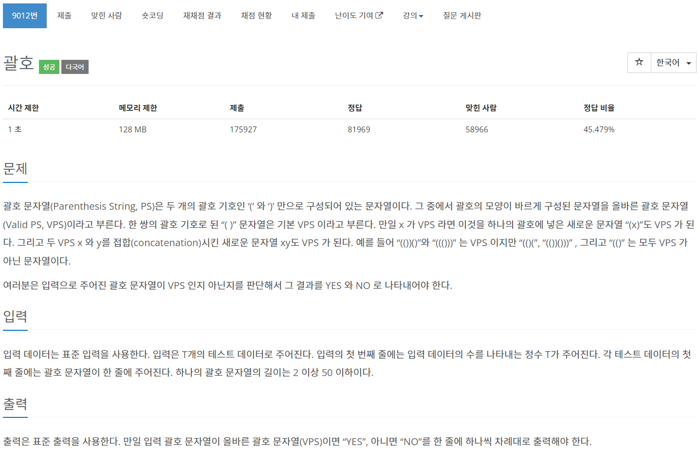 괄호 문자열(Parenthesis String, PS)은 두 개의 괄호 기호인 ‘(’ 와 ‘)’ 만으로 구성되어 있는 문자열이다. 그 중에서 괄호의 모양이 바르게 구성된 문자열을 올바른 괄호 문자열(Valid PS, VPS)이라고