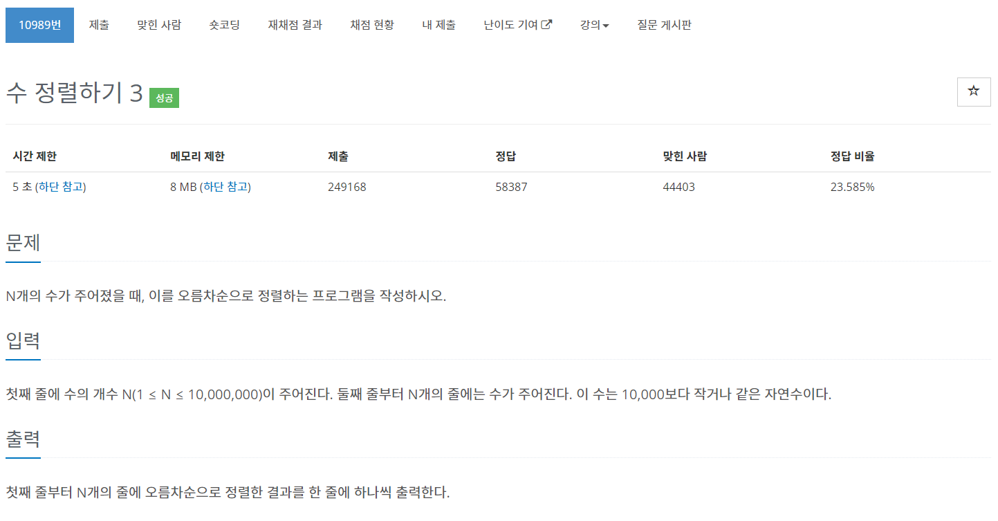 www.acmicpc.net/problem/10989 10989번: 수 정렬하기 3 첫째 줄에 수의 개수 N(1 ≤ N ≤ 10,000,000)이 주어진다. 둘째 줄부터 N개의 줄에는 숫자가 주어진다. 이 수는 10,000보다 작거나 같은 자연수이다. www.acmic