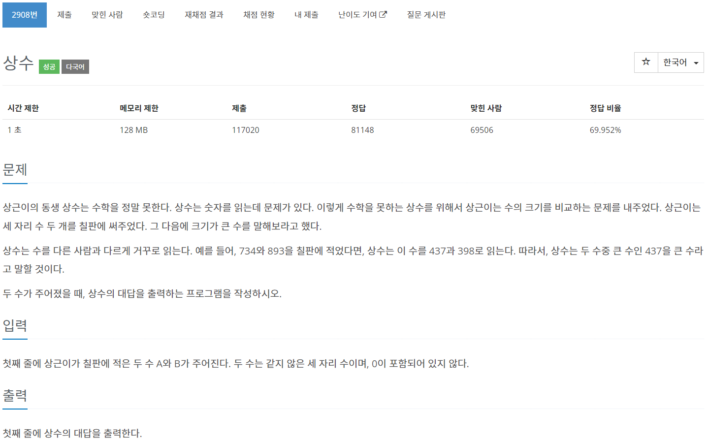 | [BaekJoon] 2908번 상수 문제풀이 (Success) (0) | 2023.04.23 |