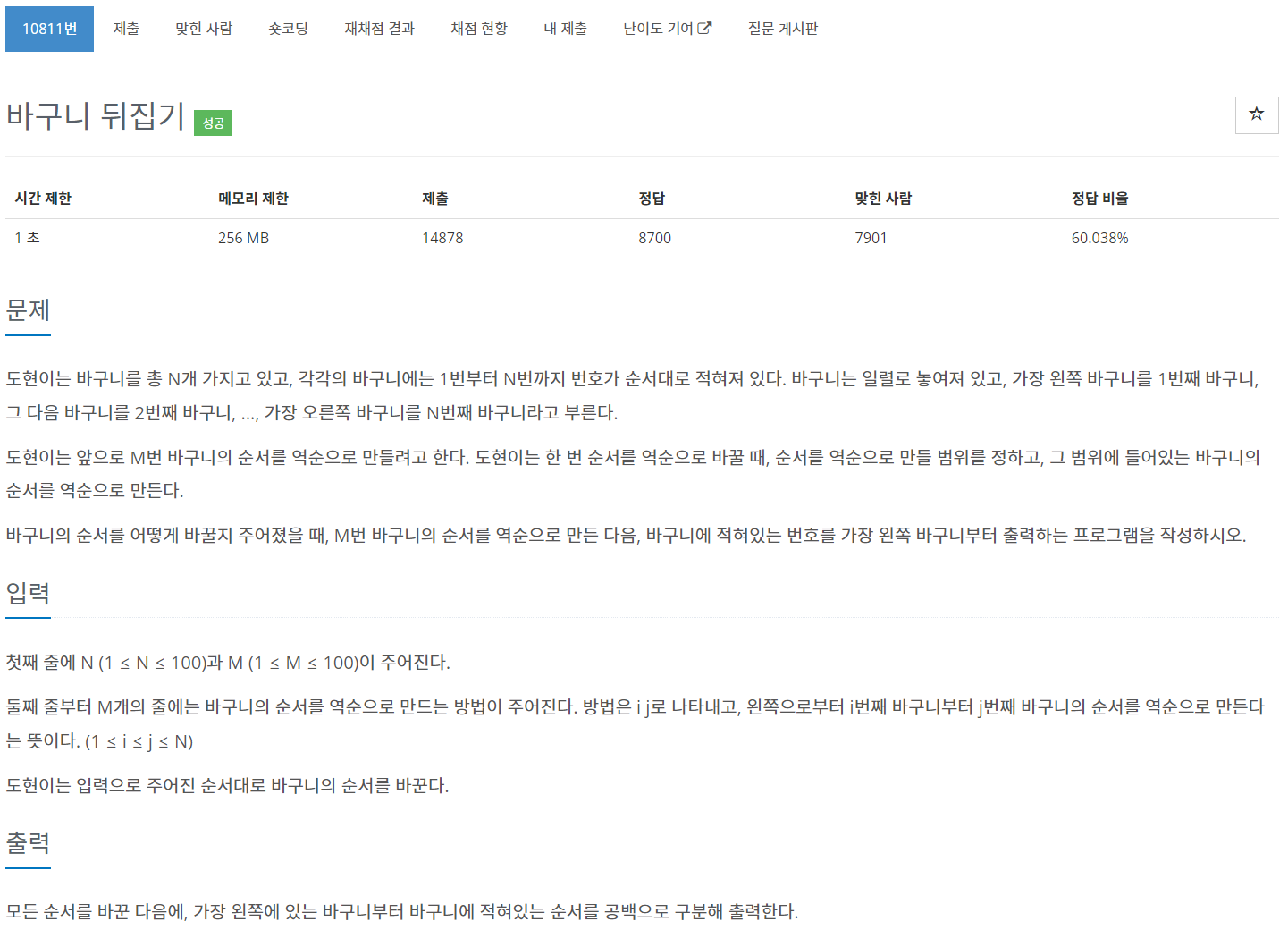 | [BaekJoon] 10811번 바구니 뒤집기 문제풀이 (Success) (1) | 2023.04.18 |