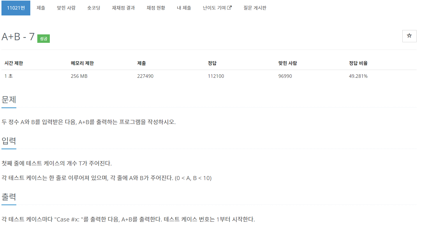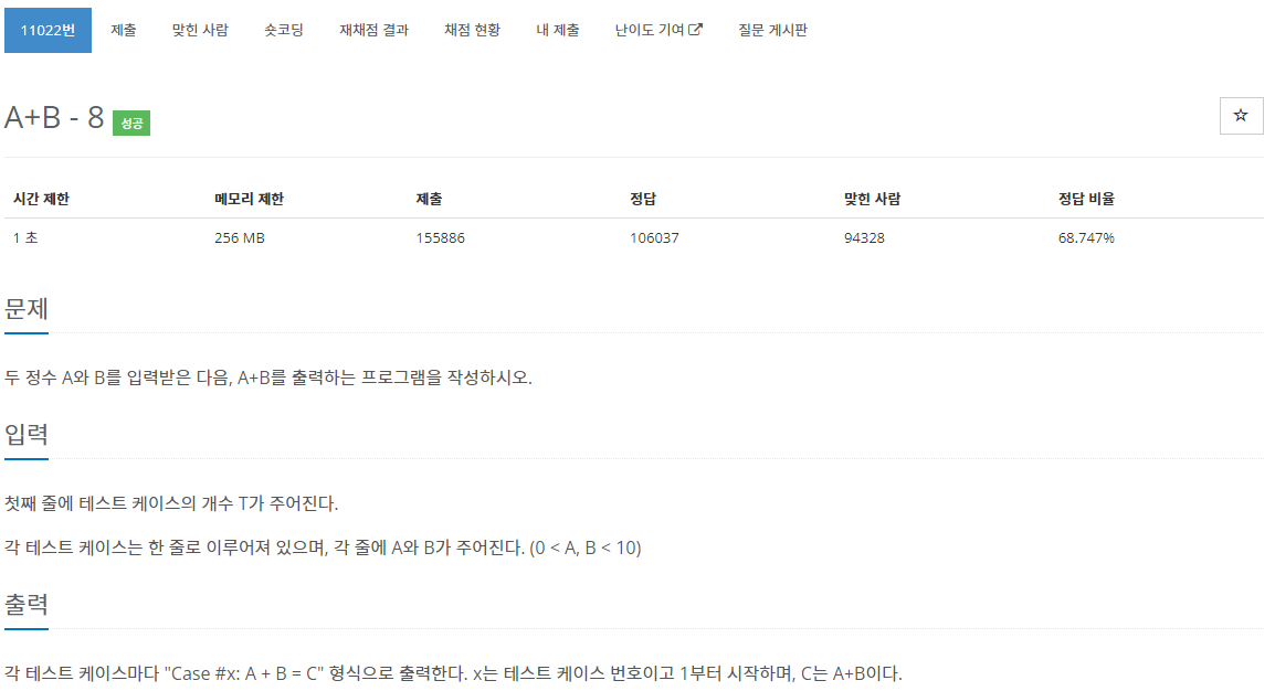 | [BaekJoon] 11022번 A+B-8 문제풀이 (Success) (0) | 2023.03.28 |