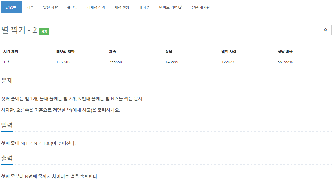 첫째 줄에는 별 1개, 둘째 줄에는 별 2개, N번째 줄에는 별 N개를 찍는 문제 하지만, 오른쪽을 기준으로 정렬한 별(예제 참고)을 출력하시오.