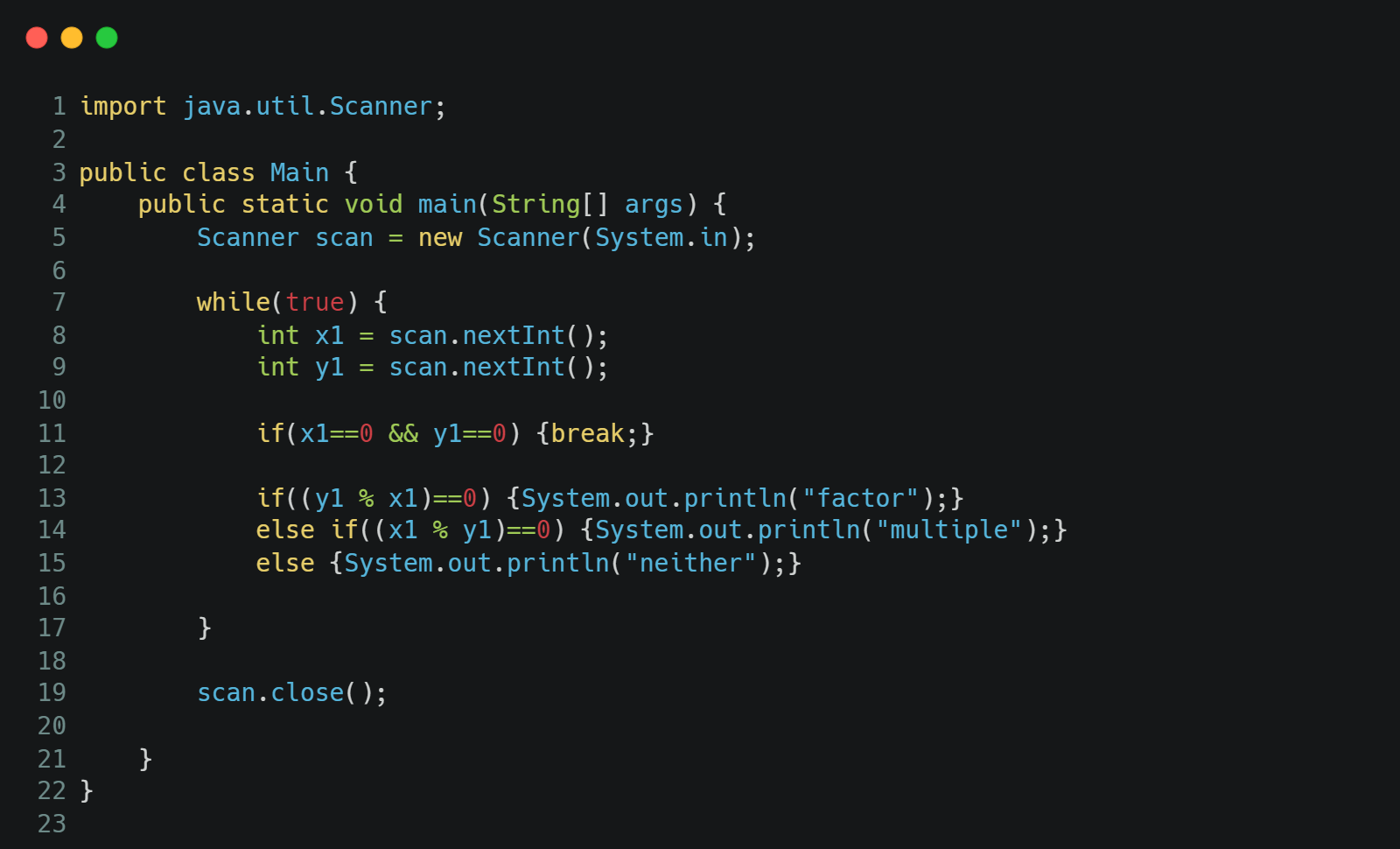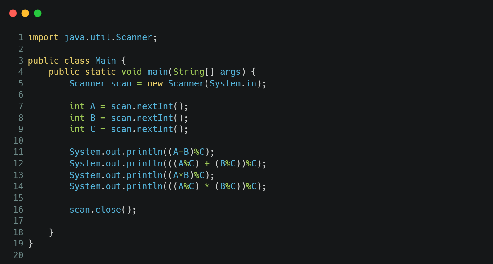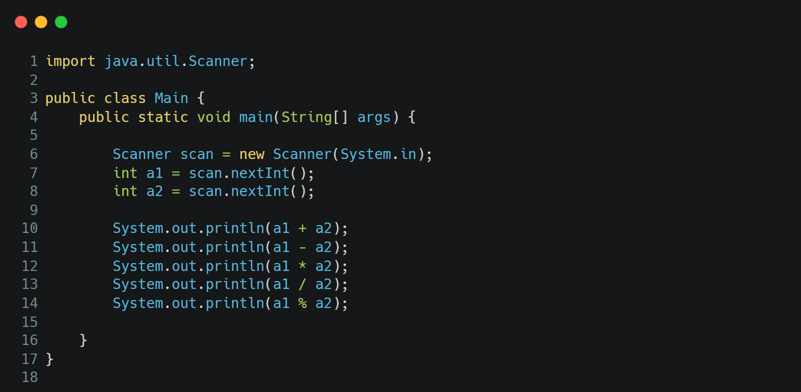 두 자연수 A와 B가 주어진다. 이때, A+B, A-B, A*B, A/B(몫), A%B(나머지)를 출력하는 프로그램을 작성하시오.