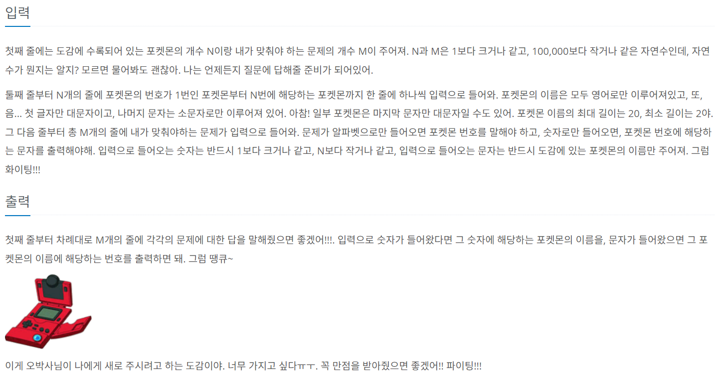 첫째 줄에는 도감에 수록되어 있는 포켓몬의 개수 N이랑 내가 맞춰야 하는 문제의 개수 M이 주어져. N과 M은 1보다 크거나 같고, 100,000보다 작거나 같은 자연수인데, 자연수가 뭔지는 알지? 모르면