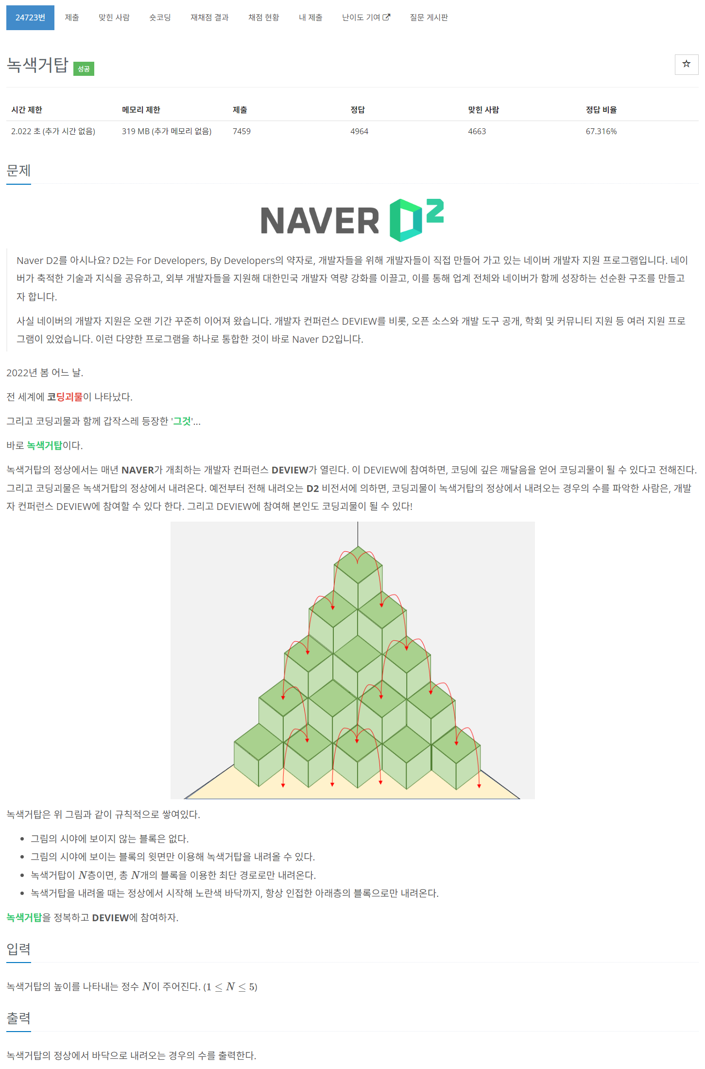 츄르사려고 코딩하는 코집사입니다. 1. [백준 알고리즘] 백준 24723번 녹색거탑 자바(JAVA) 1) 문제번호 : 24723번 2) 문제 출처 https://www.acmicpc.net/problem/24723 24723번: 녹색거탑 Naver D2를 아시나요? D2는 For