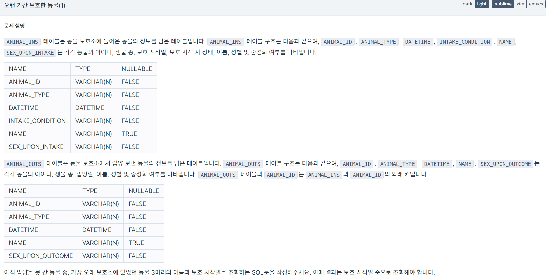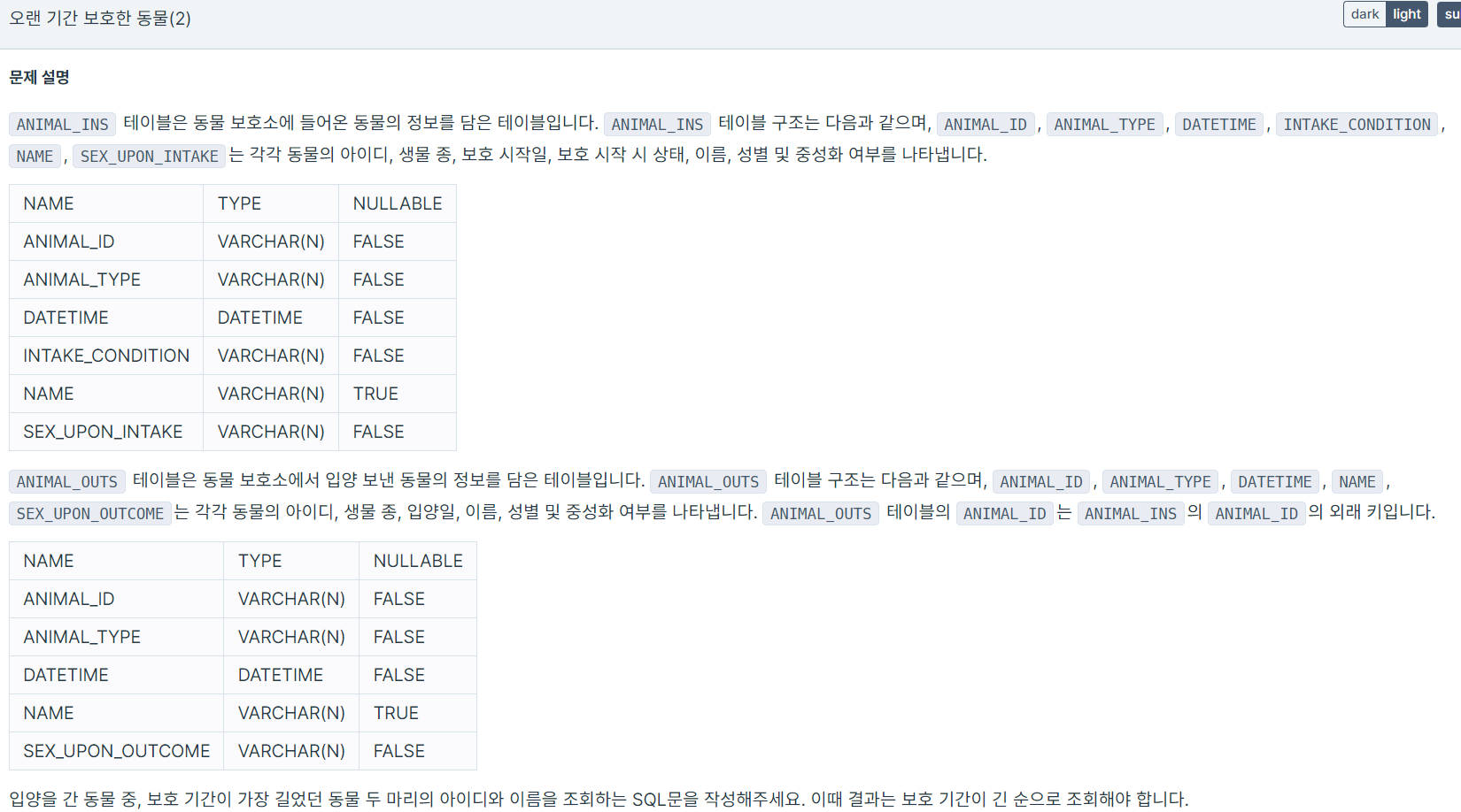 1. ANIMAL_INS, ANIMAL_OUTS 테이블