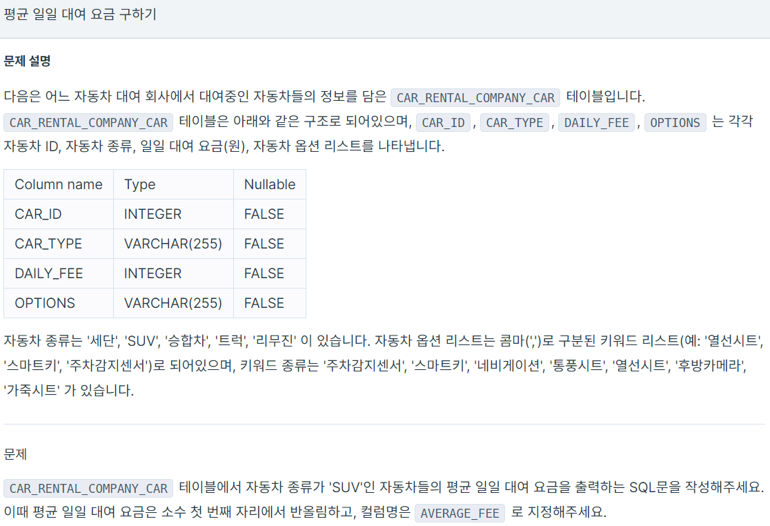5. 평균 일일 대여 요금의 컬럼명은 AVERAGE_FEE로 지정