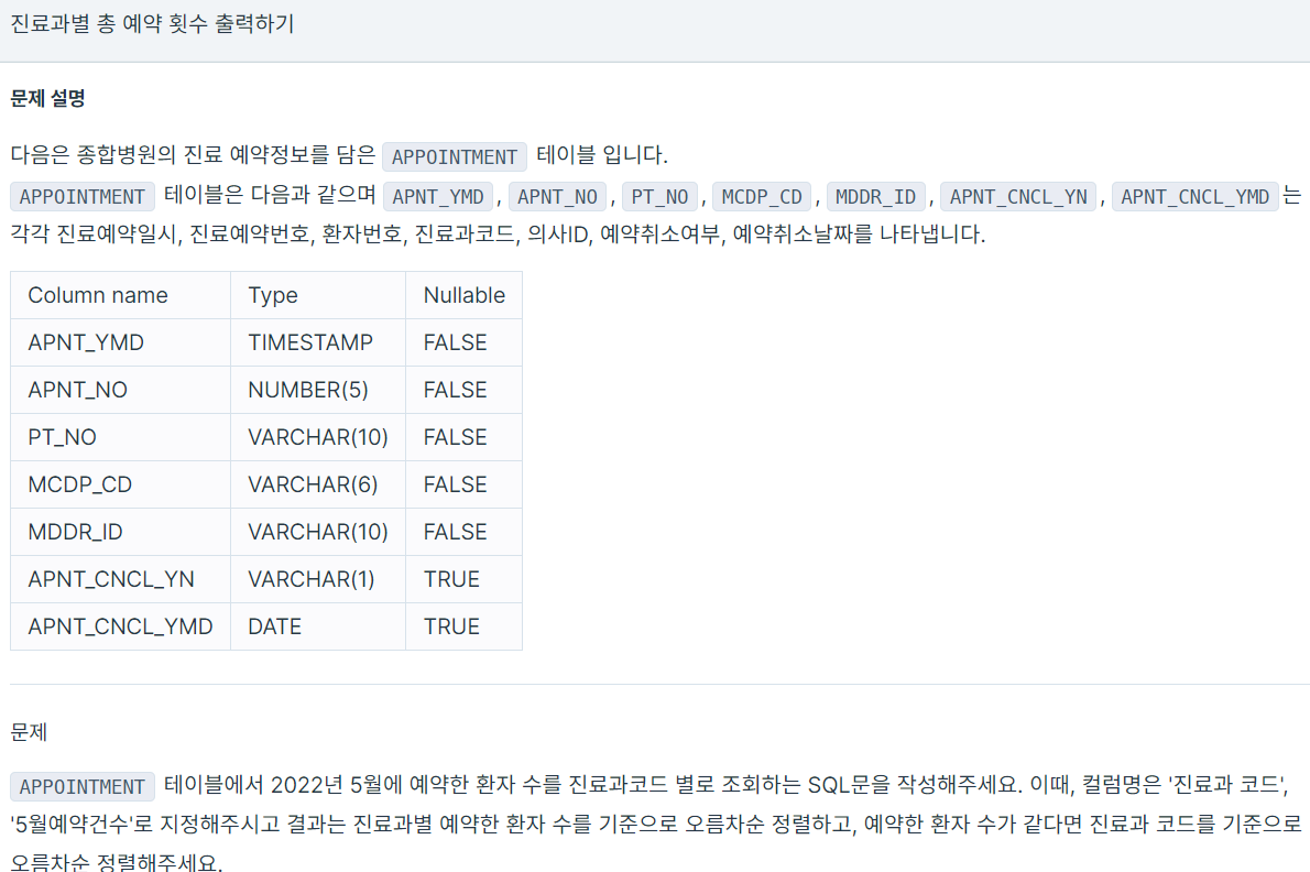 [Algorithm_SQL] 진료과별 총 예약 횟수 출력하기 (Success) (0) | 2023.10.08 |