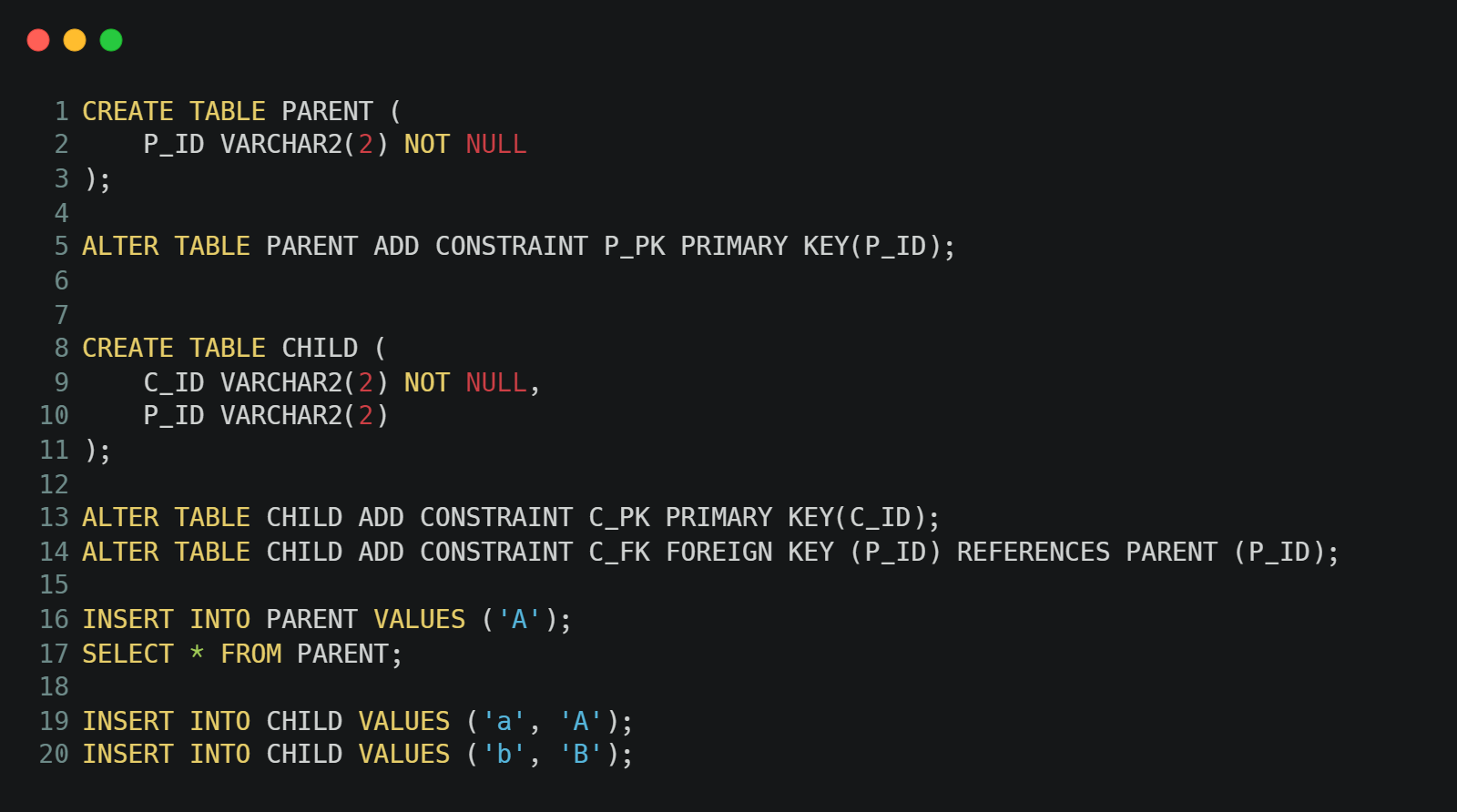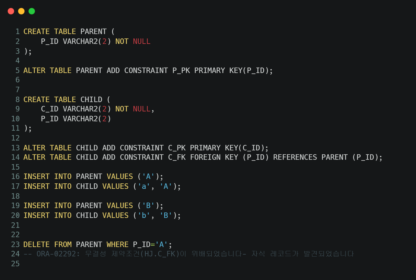 | [해결 방법] ORA-02292: 무결성 제약조건이 위배되었습니다- 자식 레코드가 발견되었습니다 (1) | 2023.03.05 |